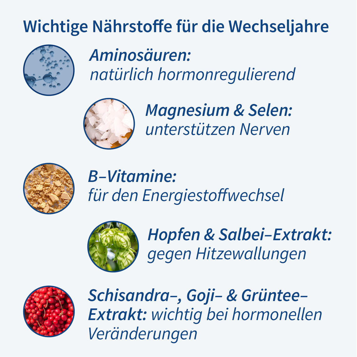 Diese einzigartige Kombination aus Aminosäuren, Vitaminen, Mineralstoffen und Pflanzenextrakten kann dazu beitragen, den natürlichen Hormonhaushalt zu stabilisieren, Energie und Gelassenheit zu fördern und die typischen Begleiterscheinungen der Wechseljahre zu mildern.