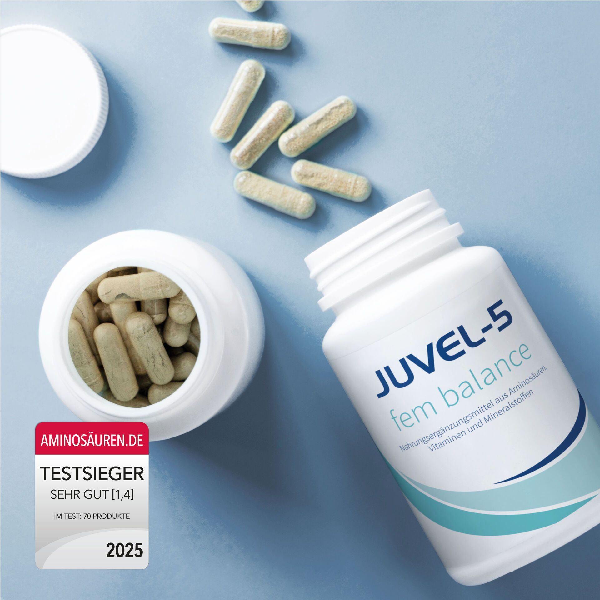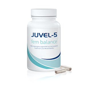 Die gezielte Kombination aus Aminosäuren, Vitaminen und Pflanzenextrakten in JUVEL–5 fem balance unterstützt den Körper dabei, sein hormonelles Gleichgewicht auf natürliche Weise zu stabilisieren.